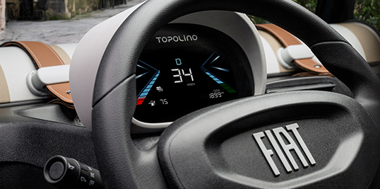 Un nouveau combiné digital : plus simple, plus lumineux et plus joyeuxTopolino devient également plus intuitive grâce à son tout nouveau combiné digital, passant de 3,5’’ à 5,7’’, avec une surface totale de 8,3’’. Le nouveau combiné digital simplifie les graphismes, améliore la lisibilité et adopte un langage visuel plus léger et chaleureux.